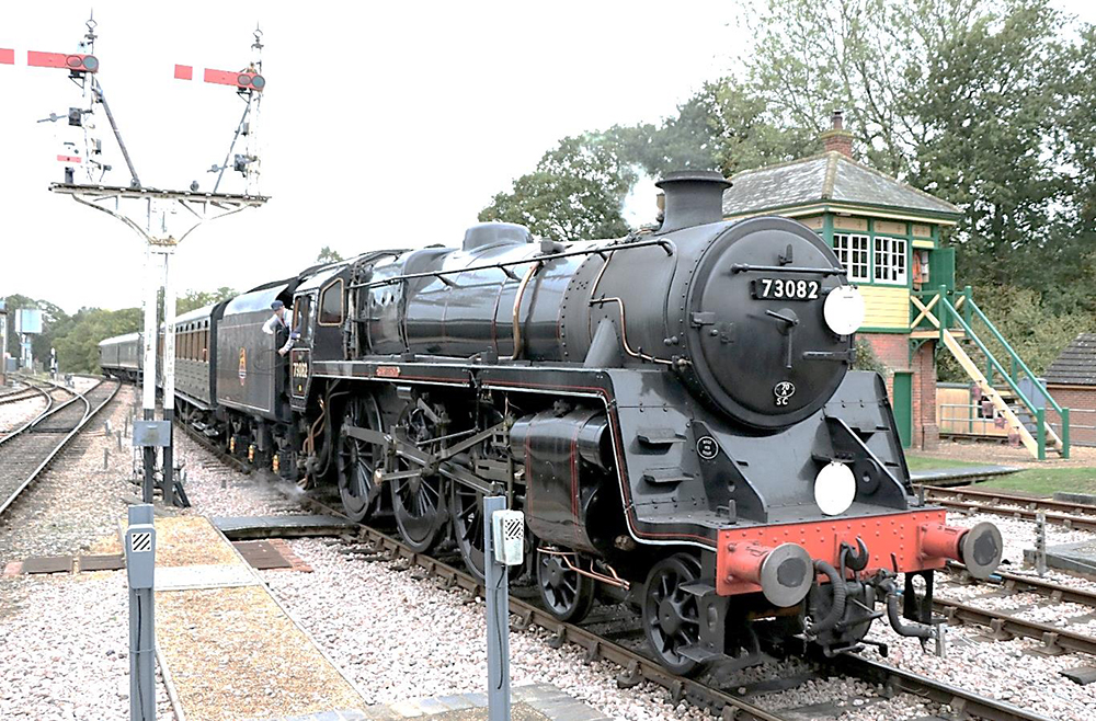 Loco n°73082 "CAMELOT", Class 5MT des BR, entrant en gare de Horsted Keynes, en tête d'un train en provenance de Sheffield Park (Août 2023)