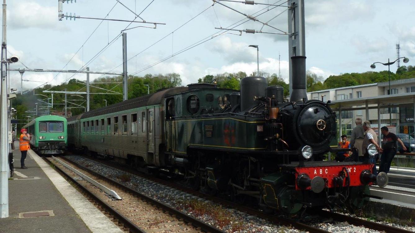 Il est temps de se diriger vers les quais de la gare de Longueville pour apercevoir de près les locomotives vapeur et autorails historiques invités et les voir rouler. En effet, le festival n'était pas limité à des présentations statiques, mais l'AJECTA avait élaboré un copieux programme de circulations de trains spéciaux vers Provins et Villiers-St-Georges, Romilly et Montereau via Flamboin. Mais durant cette journée du 6 mai, à la suite d'incidents techniques et problèmes divers, rien ne se passa comme prévu et les documents horaires remis étaient bons à jeter à la corbeille. Donc, il fallait faire avec ce qui circulait, mais d'abord identifier la destination des rames stationnant en gare, celles-ci ne faisant l'objet d'aucune annonce sonore, ni pancartage. Après renseignement auprès d'un bénévole, nous montons dans une rame à destination de Provins (voitures Inox ACPR 1126 et MFPN). Celle-ci est tirée par la 140C38 du CFTLP et poussée par une Mallet 020+020T Henschel de 1911 ex-ABC 2, préservée par le Train Thur Doller Alsace. Une très belle composition qui gagnera rapidement la cité médiévale (7 km) où elle restera près d'une heure avant de regagner Longueville, sans aucune information auprès des voyageurs. Revenus dans cette gare, nous avisons une composition autorail "Caravelle" formée des X4647 et X4716 du CFT du Sud des Ardennes (Attigny) au départ pour Villiers-St-Georges, destination intéressante car non ouverte au service voyageurs. Aux abords de cette gare, nous découvrons la reconstitution d'un camp américain de la Seconde Guerre mondiale. Le BV a fière allure, restauré extérieurement et intérieurement. Le retour vers Longueville s'avèrera totalement chaotique. Nous sommes bloqués en gare de Provins en compagnie de la rame vapeur précitée. Au bout d'une bonne heure, laissés sans aucune information, on nous invitera à quitter l'autorail pour la rame vapeur qui partira en premier... encore une bonne vingtaine de minutes plus tard. À l'arrivée à Longueville en fin d'après-midi, il ne sera bien sûr plus possible d'emprunter un quelconque éventuel autre train. Nous verrons toutefois arriver de Romilly, qu'on avait aussi espérer atteindre, un jumelage d'autorails formé du Picasso X 4039 de l'ABFC et de l'X2403 du Chemin de Fer de la Haute-Auvergne, puis la 141R1126 démarrera dans le chuintement de ses purgeurs, enlevant sa belle rame de voitures OCEM et Nord à portières latérales, pour une dernière navette Provins avec la 140C27 en pousse.