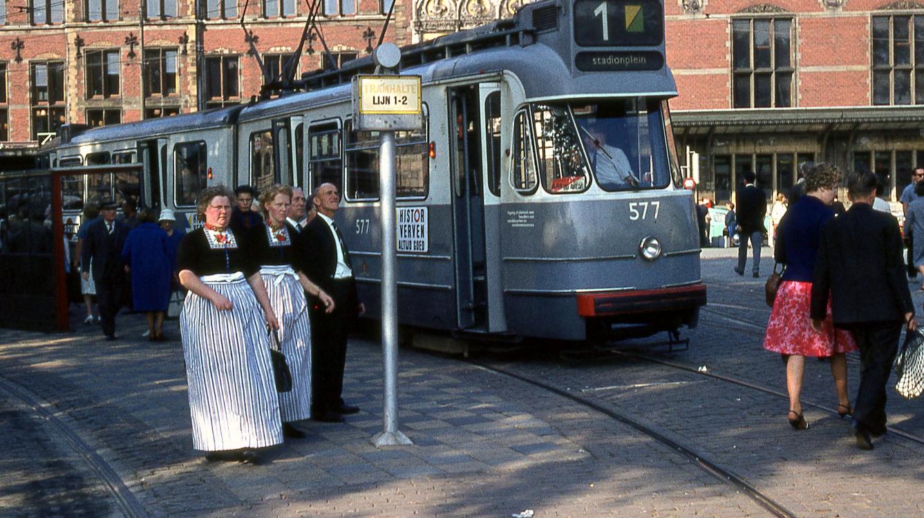 En août 1964, après Rotterdam ce sera Amsterdam (à moins que ce ne soit le contraire !). C’est une fort belle ville célèbre à plus d’un titre : canaux, musées, maison d’Anne Frank, vitrines d’un « genre spécial » et……ses trams. Amsterdam un beau réseau avec du matériel qui, à l’époque, est encore assez diversifié, même si l’aspect est souvent identique. Comme de coutume dans ces années-là, les constructeurs sont des locaux : WERKSPOOR et BEIJNES. Une des caractéristiques visuelles de ce matériel réside dans les imposants identificatifs de ligne avec des carrés avec plusieurs couleurs selon les destinations. Jusqu’en 1971 l’arrière des trams est pourvu d’une boîte à lettres.