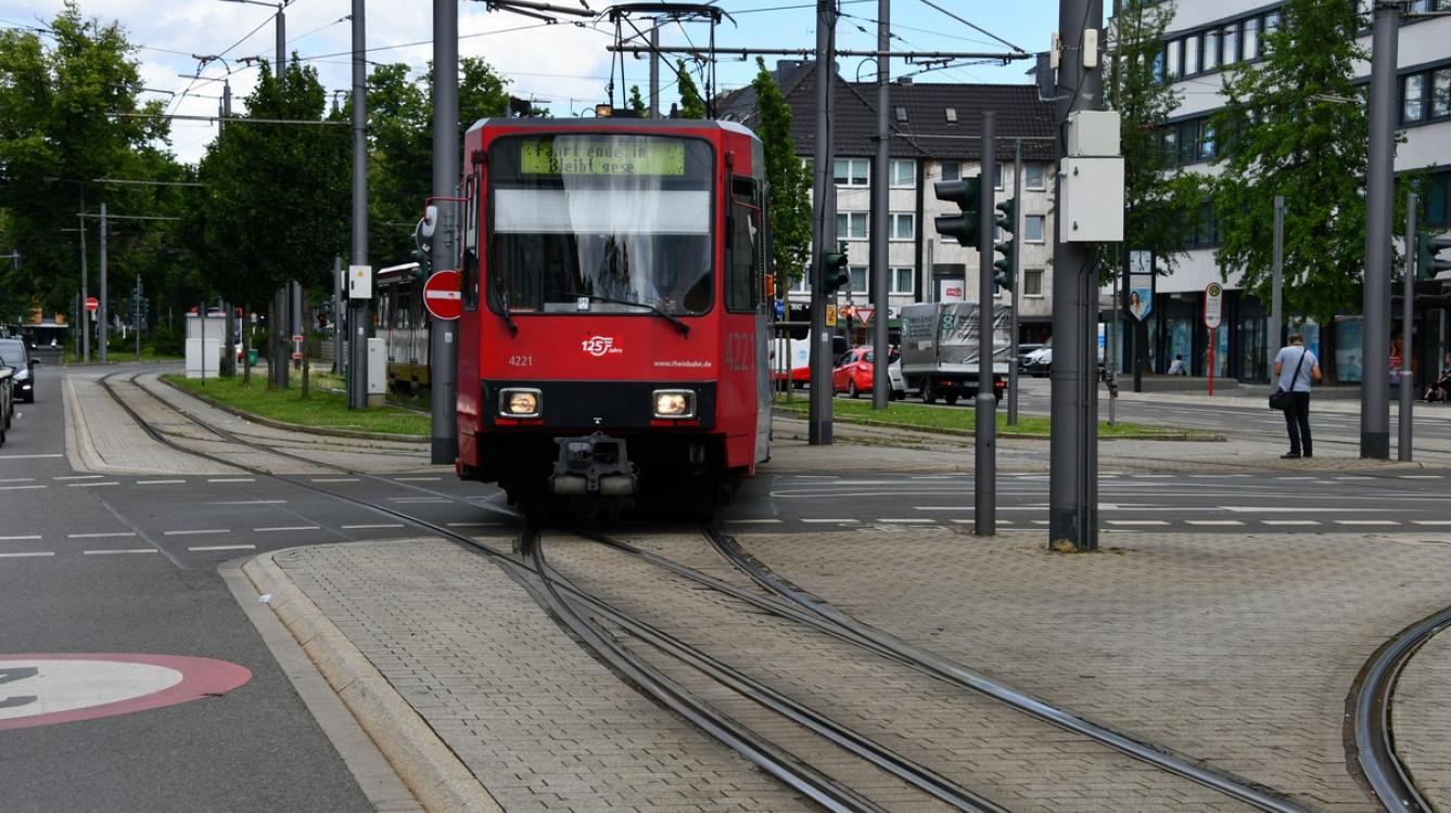 Le réseau de Krefeld long de 36 km est à voie métrique. Le double écartement s'explique par la pénétration d'une ligne de tramway interurbaine a voie normale U76 en provenance de Düsseldorf. Cette ligne a son terminus à la Rheinstrasse en plein centre ville, parcourue également par les lignes urbaines 041 a 044 de Krefeld.