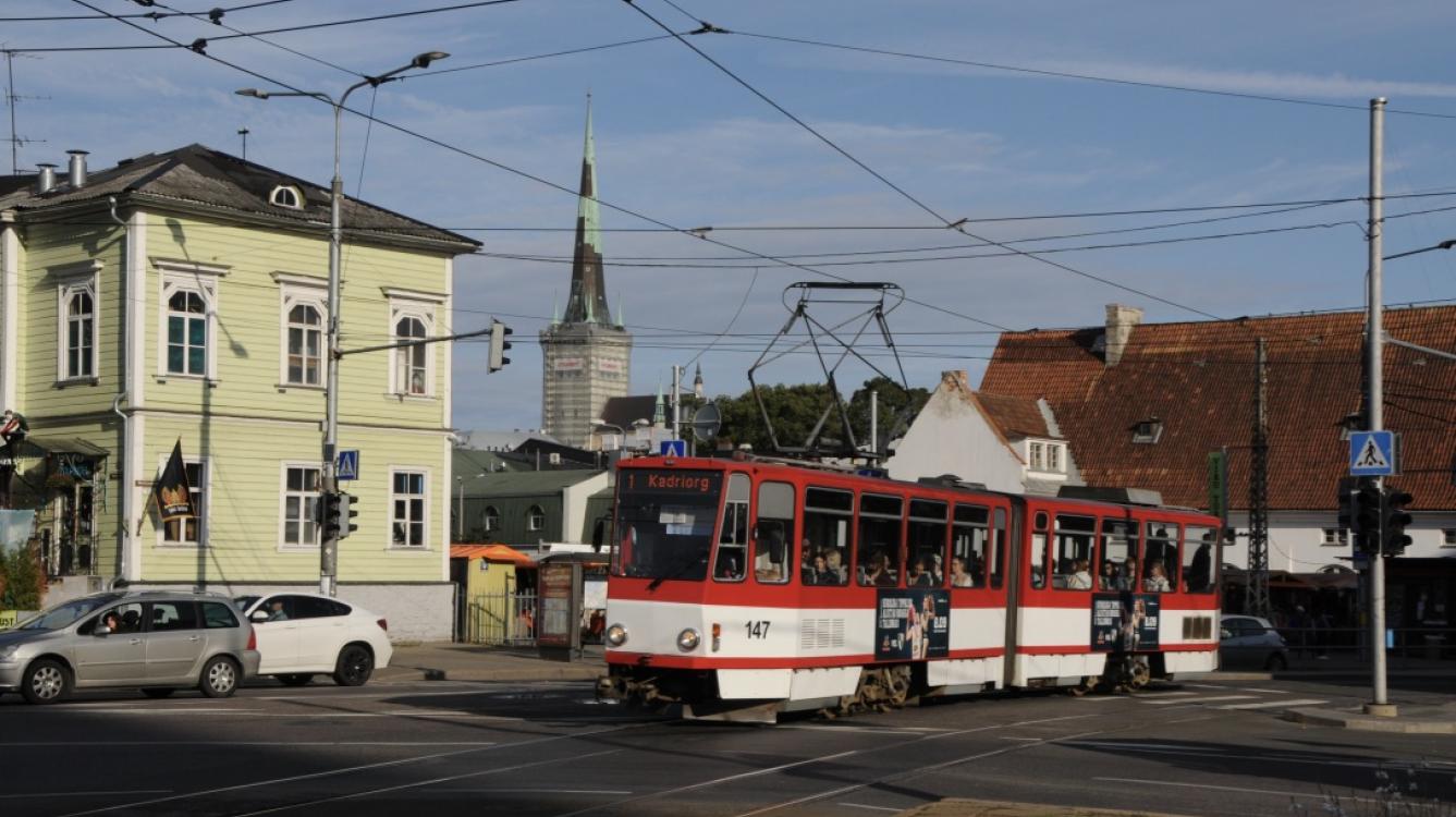 La KT4D n° 147 assurant un service de la ligne 1 Kopli - Kadriorg, a été livrée en 1983 à Erfurt et achetée par Tallinn en 2006. Elle arrive au carrefour des rues MERE PUIESTEE et HOBUJAAMA après avoir contourné le centre historique où se dresse le clocher de l’église St.Olaf.