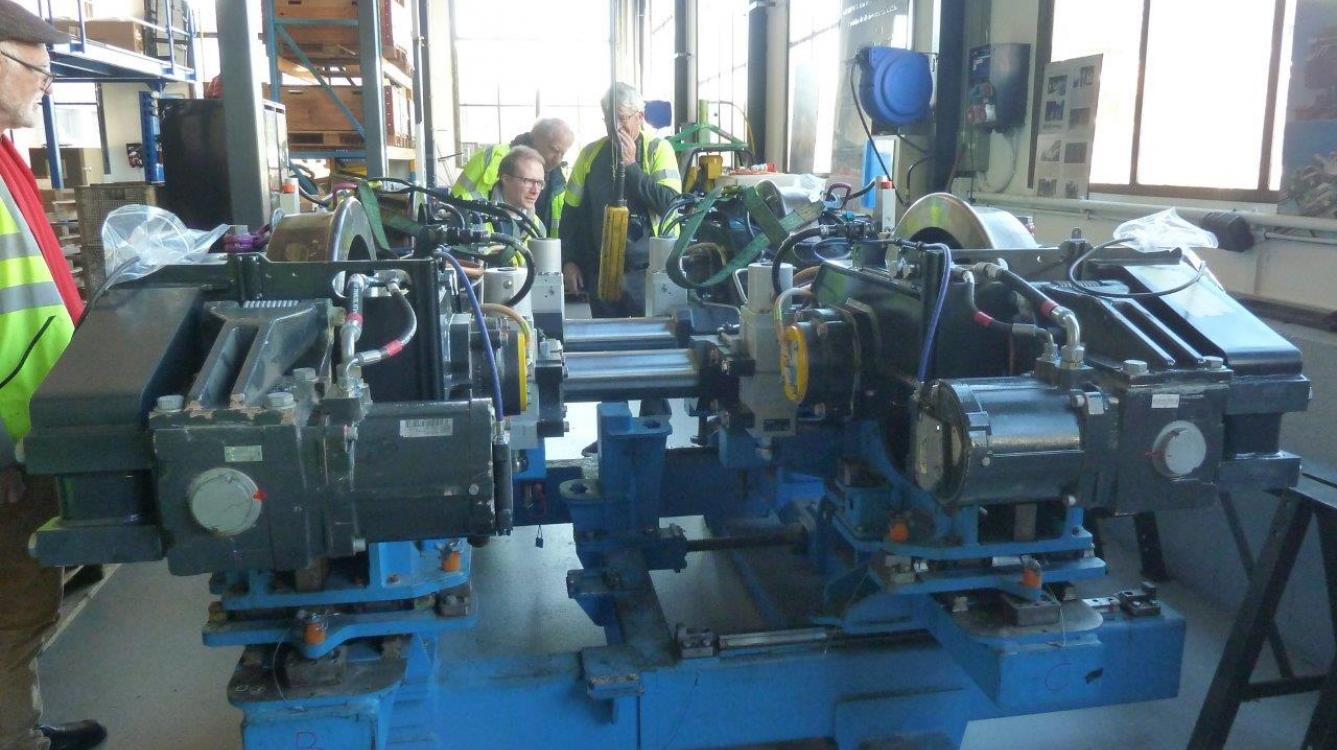 Les ateliers de Chernex assurent la maintenance de l'ensemble du matériel de la compagnie. Les matériels les plus remarquables sont des automotrices Stadler utilisées sur les trains régionaux mais aussi pour remorquer des rames de voitures telle celle dénommée "Belle Époque" que nous emprunterons un des jours suivants et la nouvelle rame "Golden Pass Express" constituée de voitures dotées de bogies à écartement variable permettant de passer automatiquement à Zweisimmen de la voie métrique du MOB à la voie normale du BLS et ainsi de relier directement Montreux à Interlaken. Nous avons utilisé ce train le dimanche 28 et nous aurons l'occasion d'y revenir. À l'atelier, nous avons d'ailleurs pu voir un tel bogie conçu par le MOB et construit par Alstom.